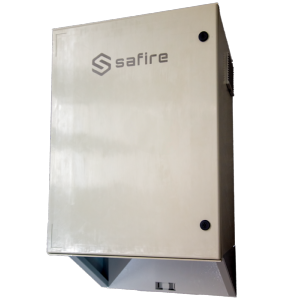 Armario inteligente para instalaciones donde no se dispone de conexión de red y Luz. Versión 220V AC con carga rápida 17 amperios hora conectada a batería de Litio recomendada (48V 100A) recomendado para farolas, modulo inteligente integrado con protecciones eléctricas principales (diferencial, magnetotérmico y SDP), switch POE L2 con 2 bocas HIGH POE con logo SAFIRE. Aplique adicional para peso de la caja.