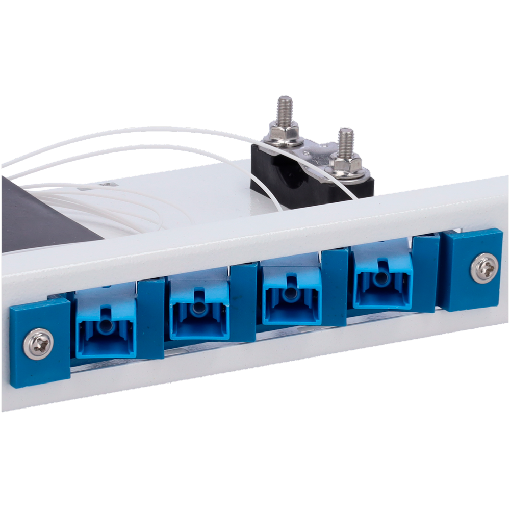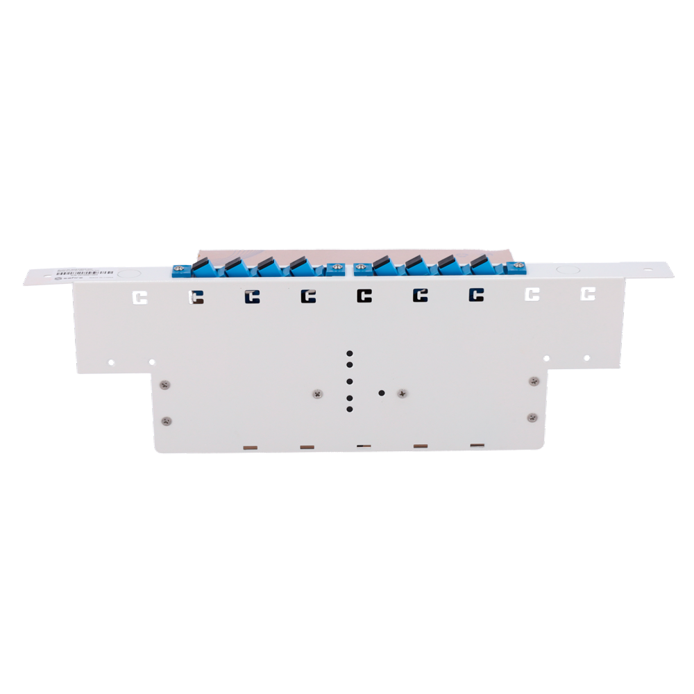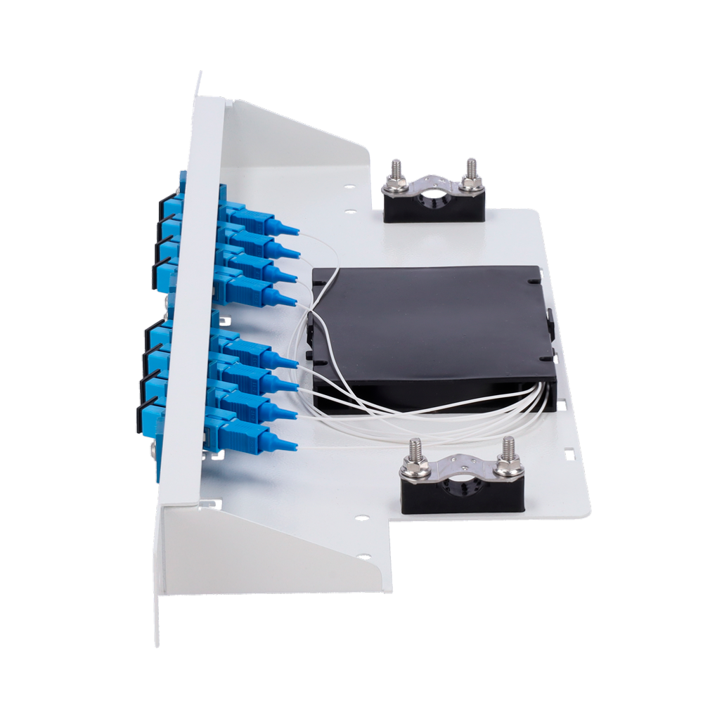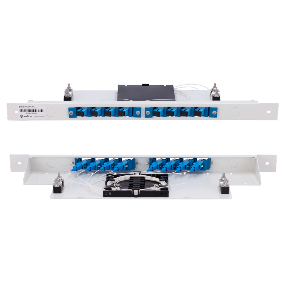 Patch panel de fibra óptica con 8 conectores SC, fácil montaje.