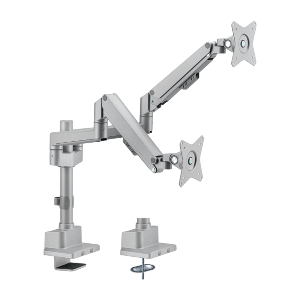 Un soporte de doble brazo de instalación en mesa para monitores es un accesorio diseñado para sostener y ajustar los dos monitores de forma ergonómica. Se fija al borde o a la superficie del escritorio mediante una base o abrazadera, y permite mover el monitor con libertad en diferentes direcciones: altura, inclinación, giro y distancia.